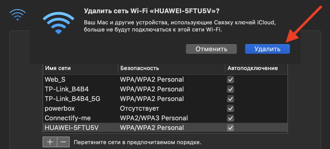 В приглашении нажмите кнопку «Удалить», чтобы забыть о сети. Это приведет к удалению учетных данных для входа в сеть из Связки ключей iCloud, а также сделает ее недоступной для всех других устройств Apple.