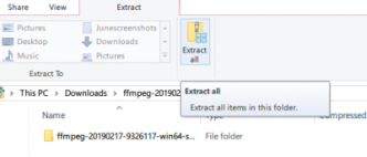 Перейдите в загруженную папку, где находится файл FFmpeg.zip. Щелкните правой кнопкой мыши папку Zip и в раскрывающемся меню выберите извлечь.