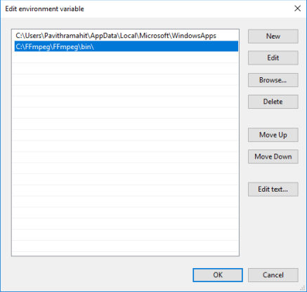 Добавьте FFmpeg в path Windows, используя переменные среды