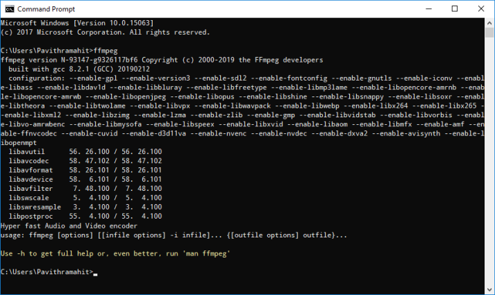 Запустите командную строку, введите команду ffmpeg в терминале командной строки и нажмите Enter.