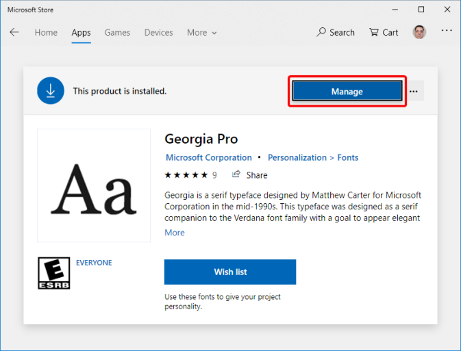 Далее на странице вы получите пару скриншотов, на которых изображен шрифт. Когда вы решите установить шрифт, нажмите или нажмите кнопку «Получить» (она удобно перемещается в верхний правый угол при прокрутке вниз). В верхней части страницы отображается индикатор выполнения загрузки. Когда установка будет завершена, вы получите уведомление, и кнопка приобретения изменится на Управление.