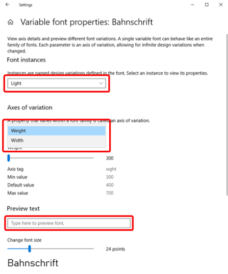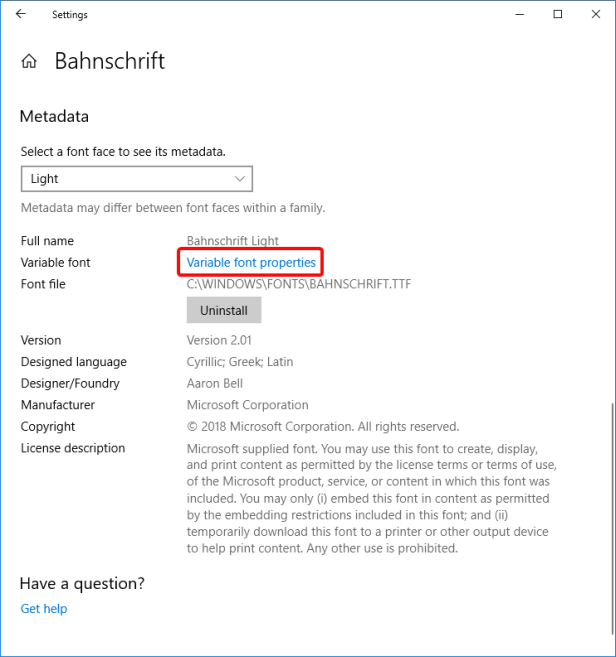 Если выбранный вами шрифт является переменным, в окне сведений о шрифте отображается дополнительная ссылка с именем Свойства шрифта переменной. Нажмите здесь.
