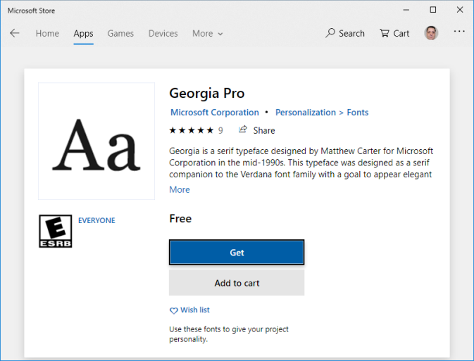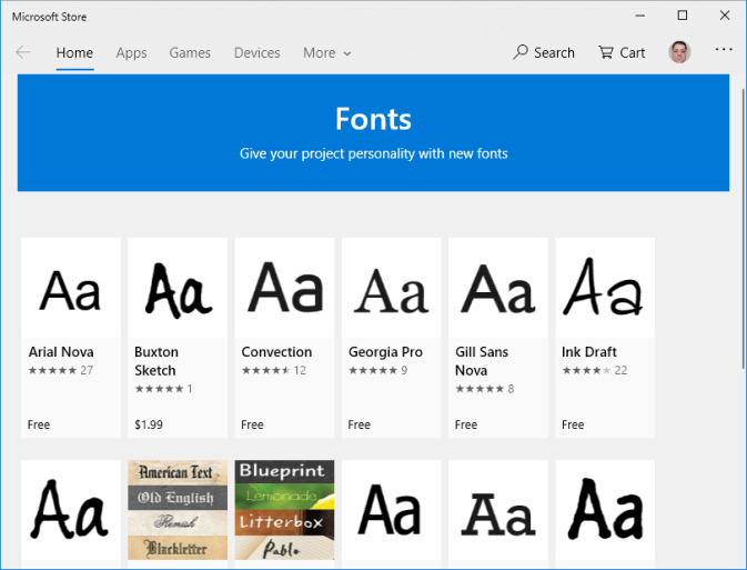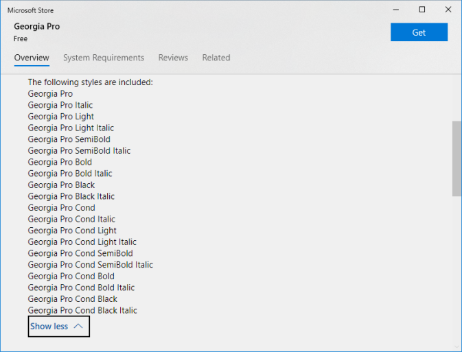 Магазин Microsoft открывается в разделе «Шрифты». В настоящее время список доступных шрифтов довольно мал. Укажите шрифт, который вы хотите установить, и нажмите или нажмите на него.