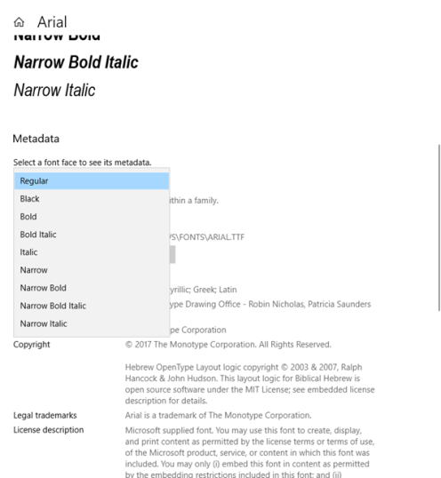 Если вы выбрали семейство шрифтов, вы получите раскрывающееся меню со всеми вариантами шрифтов в семействе. Раздел метаданных обновляется на основе шрифта, выбранного в раскрывающемся меню.