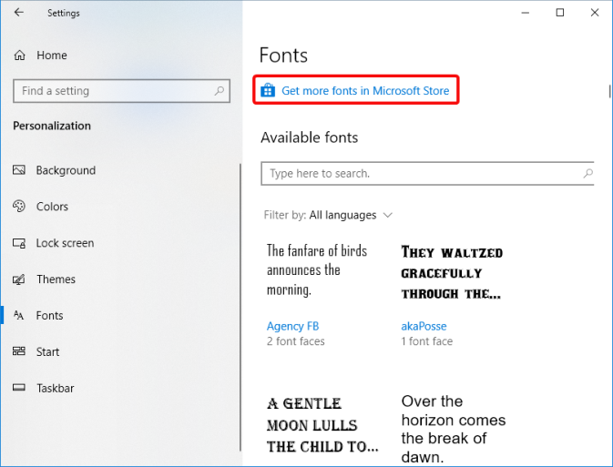 Когда вы открываете раздел шрифтов в приложении « Настройки» (перейдите к «Настройки» → «Персонализация» → «Шрифты» ), Microsoft в верхней части страницы объявляет, что в Магазине Майкрософт можно найти другие шрифты. Нажмите или коснитесь ссылки, которая гласит: «Получить больше шрифтов в магазине Microsoft».