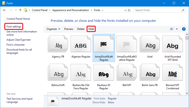 В Windows 10 есть пара настроек, связанных со шрифтами, которые не попали в приложение «Настройки». Они все еще находятся в панели управления. Одна из настроек связана с возможностью скрытия установленных шрифтов. Концепция заключается в том, что вы можете сохранить шрифт для отображения любого текста, отформатированного с его помощью, но вы больше не можете использовать его (когда-то скрытый) и применять его к новым текстам. Вы можете сделать это для отдельных шрифтов или скрыть шрифты в зависимости от языковых настроек. Управление настройками панели управления в Windows 10 идентично управлению в Windows 7 и Windows 8.1.