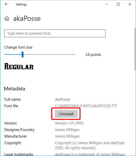 Когда вы нажимаете на него, он возвращает вас в раздел шрифтов в настройках, где вы можете проверить вновь установленный шрифт.
