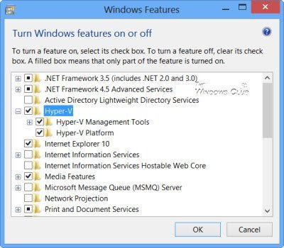 Перейдите в «Программы и компоненты» > нажмите «Включить или отключить функции Windows» > «Выбрать Hyper-V». Нажмите кнопку ОК, чтобы установить обновление. Помните, это не будет видно, если у вас есть что-то, кроме Windows 10 Enterprise, Professional или Education