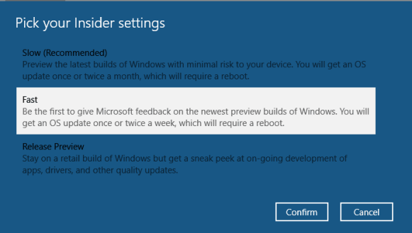 • Далее нужно выбрать канал для обновлений. В этом случае вам придется подписаться на Fast Ring.