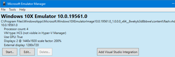 Эмулятор Windows 10X поставляется с менеджером эмулятора. Он доступен в меню «Пуск» в разделе «Эмулятор Microsoft». Это инструмент разработчика, который перечисляет все эмуляторы Microsoft, установленные на вашем компьютере. Вы можете просмотреть статус и запустить данный эмулятор независимо от Visual Studio. Вы также можете запустить Emulator Manager из записи Microsoft Emulator в меню «Пуск».