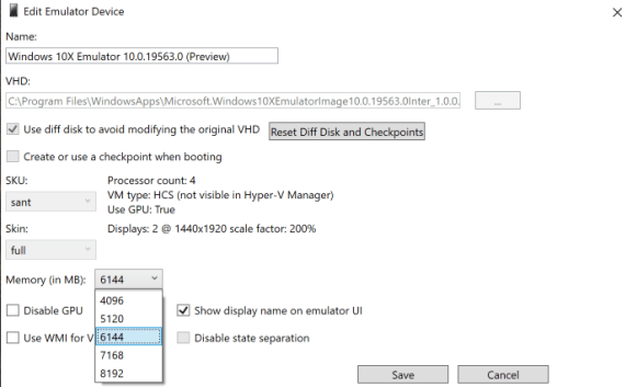 Менеджер эмулятора позволяет редактировать конфигурацию изображения. Вы можете изменить расположение VHD, SKU, Skin, настроить память, создать или использовать контрольную точку и многое другое. У вас также есть кнопка, которая позволяет запускать эмулятор с интеграцией Visual Studio. Если вы наконец готовы разработать и обновить свое приложение, выберите это.