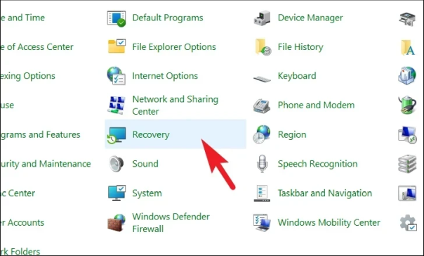 После этого найдите и щелкните плитку «Восстановление» в сетке значков.