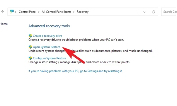 Затем нажмите на опцию «Открыть восстановление системы» из списка. Это откроет отдельное окно на вашем экране.