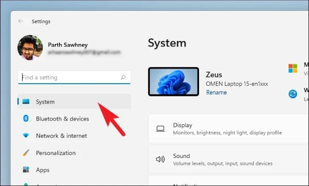 Откройте приложение «Настройки» на своем ПК. После этого в окне «Настройки» убедитесь, что вы выбрали вкладку «Система» на левой боковой панели.
