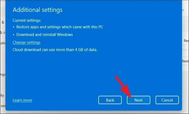 Если вы решили изменить настройки, вы можете настроить следующие параметры на следующем экране. Вы можете отказаться от восстановления приложений и настроек, щелкнув тумблер в разделе «Восстановить предустановленные приложения?». вариант и приведение его в положение «Нет». Вы даже можете переключиться с облачной загрузки на локальную установку, щелкнув тумблер в разделе «Загрузить Windows?». возможность изменить способ установки. После настройки в соответствии с вашими предпочтениями нажмите кнопку «Подтвердить», чтобы продолжить.