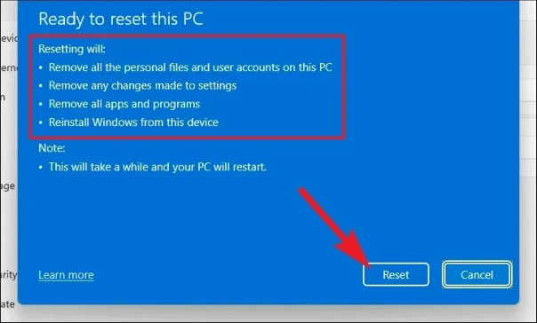 После этого Windows перечислит все последствия перезагрузки компьютера для вашей системы. Внимательно прочитайте их и нажмите «Сброс», чтобы начать процесс сброса.