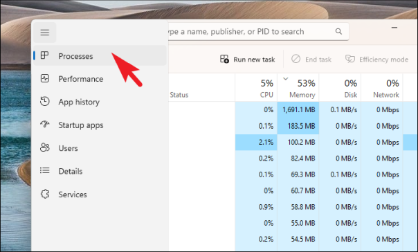 Затем в окне диспетчера задач убедитесь, что вы выбрали вкладку «Процессы».