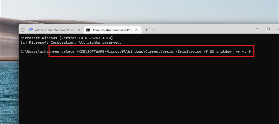 reg delete HKCUSOFTWAREMicrosoftWindowsCurrentVersionIrisService /f && shutdown -r -t 0