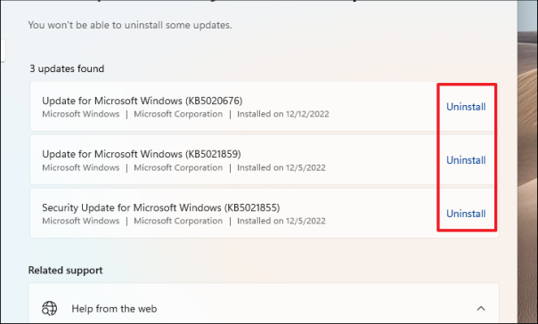 Затем проверьте самое последнее установленное обновление и нажмите кнопку «Удалить» на плитке, чтобы продолжить его удаление. Затем посмотрите, решена ли проблема.