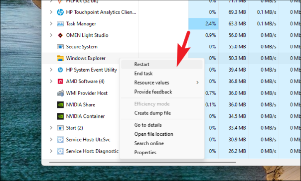 Затем найдите в списке процесс «Проводник Windows» и щелкните его правой кнопкой мыши. Наконец, нажмите на опцию «Перезагрузить».