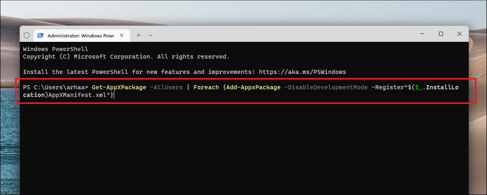 Get-AppXPackage -AllUsers | Foreach {Add-AppxPackage -DisableDevelopmentMode -Register"$($_.InstallLocation)AppXManifest.xml"}