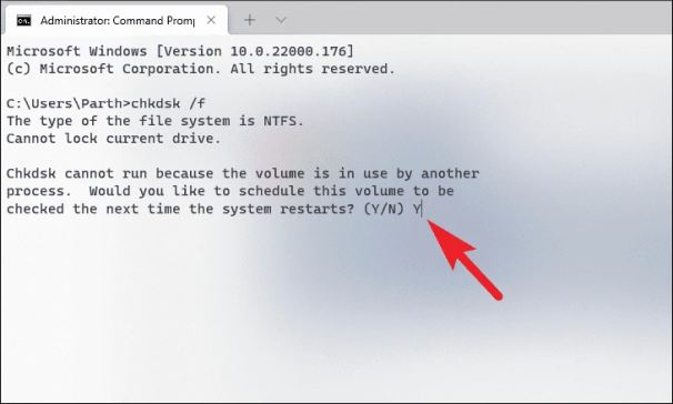 Инструментchkdsk автоматически начнет сканирование тома хранилища перед загрузкой ПК при каждом следующем перезапуске и исправит любые ошибки, если обнаружит их. Посмотрите, сохраняется ли проблема после этого. Если да, перейдите к следующему исправлению.