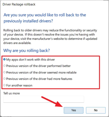В противном случае откроется окно отката пакета драйверов. Выберите любую причину отката драйвера и нажмите «Да».