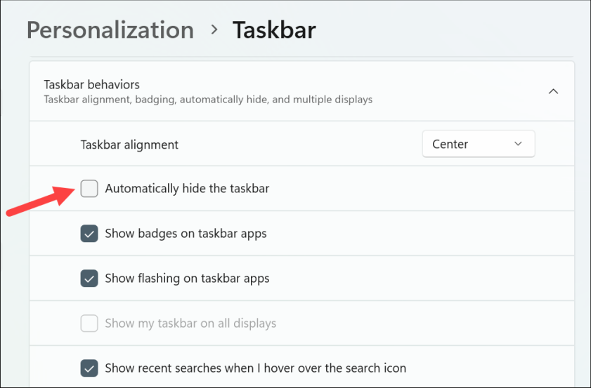Если вы не хотите, чтобы панель задач скрывалась в будущем, вы можете изменить это поведение в настройках. Щелкните правой кнопкой мыши на панели задач и выберите «Настройки панели задач». Кроме того, вы можете открыть «Настройки» с помощью сочетания клавиш Windows+ и перейти к Настройки > Персонализация > Панель задач, чтобы получить доступ к тому же экрану.