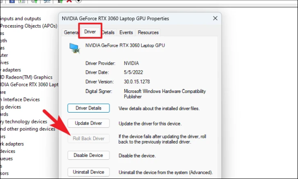 Затем перейдите на вкладку «Драйвер» и нажмите кнопку «Откатить драйвер», чтобы продолжить. Если кнопка неактивна, это просто означает, что предыдущая версия драйвера недоступна в системе или последнее обновление было основным. Ознакомьтесь с нашим специальным руководством, чтобы узнать, как в этом случае откатить драйверы.