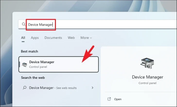 Чтобы откатить драйвер, перейдите в меню «Пуск» и введите «Диспетчер устройств» в поле поиска, чтобы выполнить поиск. Затем в результатах поиска щелкните плитку «Диспетчер устройств», чтобы продолжить.