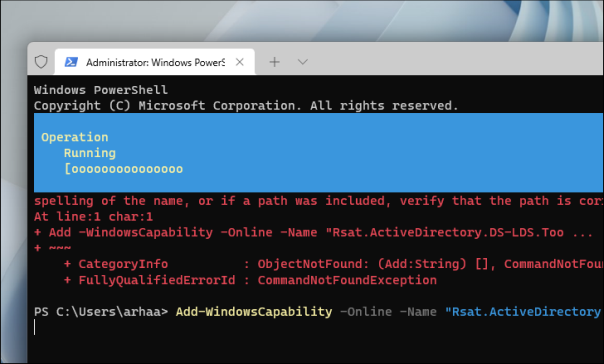 После этого в окне командной строки введите или скопируйте+вставьте указанную ниже команду и нажмите Enterна клавиатуре, чтобы выполнить команду и установить ADUC в вашей системе.