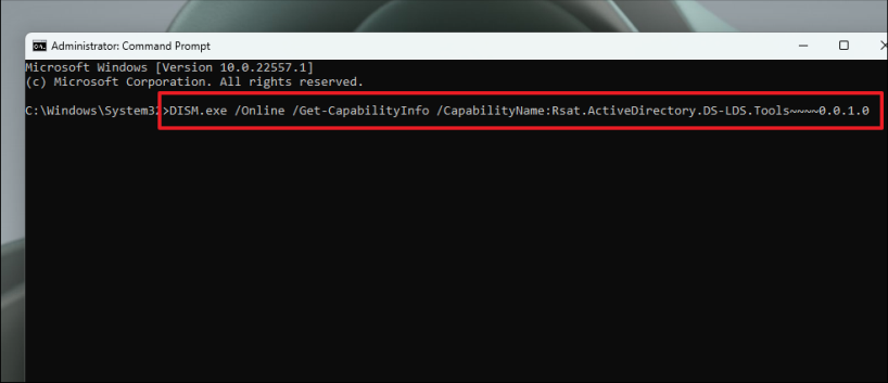 DISM.exe /Online /Get-CapabilityInfo /CapabilityName:Rsat.ActiveDirectory.DS-LDS.Tools~~~~0.0.1.0