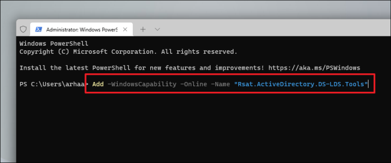 Add-WindowsCapability -Online -Name "Rsat.ActiveDirectory.DS-LDS.Tools"