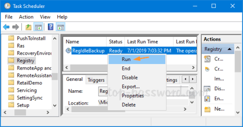 5. Если вам нужно создать резервные копии реестра вручную, просто откройте планировщик заданий и перейдите в MicrosoftWindowsRegistry. Щелкните правой кнопкой мыши задачу RegIdleBackup и выберите «Выполнить».