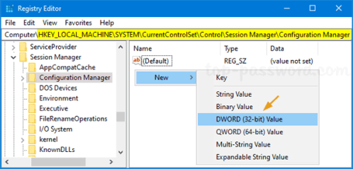 2. Найдите этот ключ: HKEY_LOCAL_MACHINESYSTEMCurrentControlSetControlSession ManagerConfiguration Manager. На правой панели щелкните правой кнопкой мыши пустое пространство и выберите Новый → DWORD (32-bit) значение.