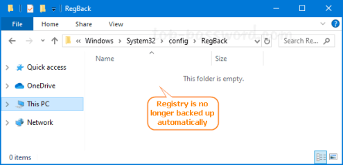 Начиная с обновления за апрель 2018 года (версия 1803), Windows 10 прекратила автоматическое резервное копирование реестра в папку RegBack, и Microsoft рекомендует пользователям использовать точку восстановления системы в случае повреждения реестра. Перейдя в папку WindowsSystem32configRegBack, вы обнаружите, что она пуста.