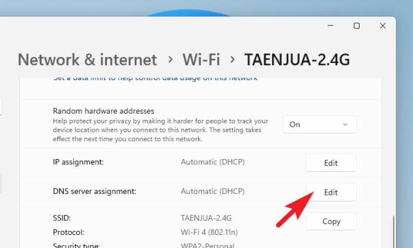 После этого прокрутите, чтобы найти «Назначение DNS-сервера», и нажмите «Изменить», чтобы продолжить. Это откроет отдельное окно на вашем экране.