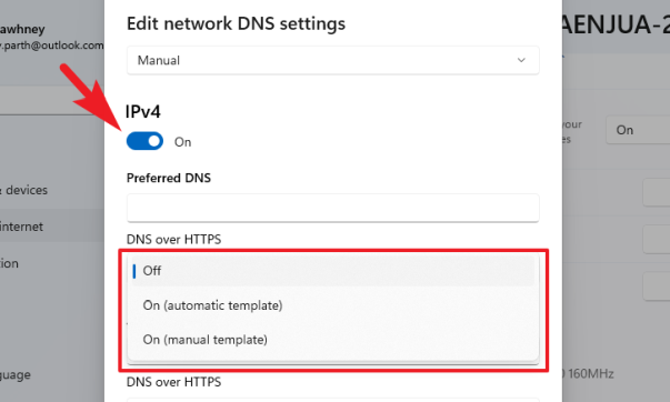 Теперь включите переключатель «IPv4», чтобы получить доступ к настройкам. После этого щелкните раскрывающийся список «DNS через HTTPS» и выберите один из вариантов. Для вашего удобства мы предоставили суть для каждого из них: