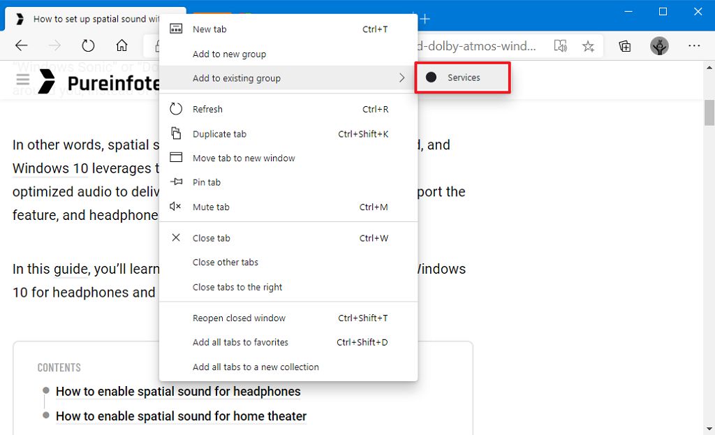 - Щелкните правой кнопкой мыши другие вкладки, выберите меню «Добавить в существующую группу» и выберите группу, в которую вы хотите добавить вкладку.