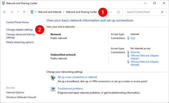 Панель управления предлагает аналогичный, еще более длительный подход. Начните с открытия панели управления и перейдите в раздел «Сеть и Интернет» > «Центр управления сетями и общим доступом». Затем в левой части окна нажмите или коснитесь «Изменить настройки адаптера».