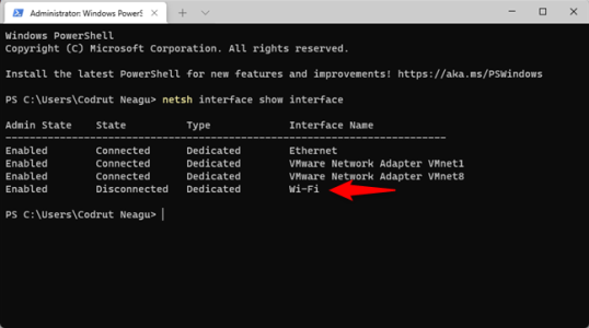Это показывает вам список сетевых карт, установленных на вашем компьютере или устройстве с Windows 11. Проверьте это и посмотрите, какое имя у вашего адаптера Wi-Fi. Например, на следующем снимке экрана вы можете увидеть, что имя интерфейса нашего адаптера Wi-Fi — Wi-Fi .