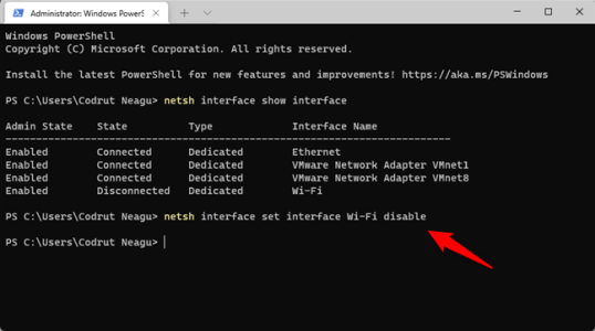 6. Как включить или отключить адаптер Wi-Fi в Windows 11 из PowerShell, командной строки или терминала.