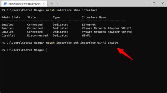 Чтобы включить Wi-Fi, вы можете выполнить ту же команду, но изменить disable с помощью enable в конце: netsh interface set interface [имя адаптера Wi-Fi] enable.