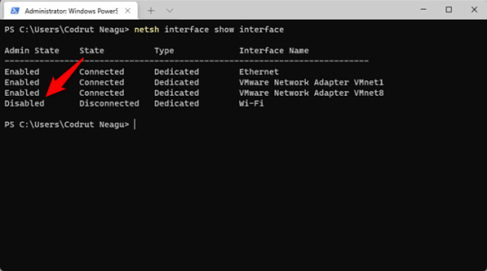 Эти команды выполняются незаметно, поэтому вы не получите никаких сообщений при их запуске. Однако вы можете использовать первый (netsh interface show interface), чтобы проверить состояние администратора вашей беспроводной карты в любой момент.