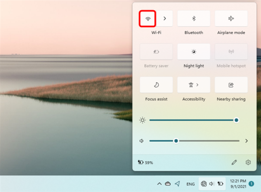 Независимо от значка, который вы видите на панели задач Windows 11, щелкните или коснитесь его. Кроме того , вы можете также использовать сочетание клавиш Windows + A. Это открывает всплывающее окно с несколькими быстрыми настройками, а также любыми уведомлениями, которые вы могли получить на свой компьютер. Среди них также должна быть кнопка Wi-Fi , которая выглядит так: