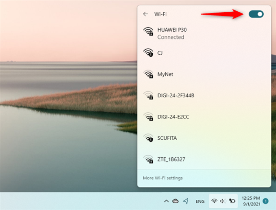 В любом случае вы также получаете переключатель в правом верхнем углу всплывающего окна, который можно использовать для включения или отключения Wi-Fi в Windows 11.