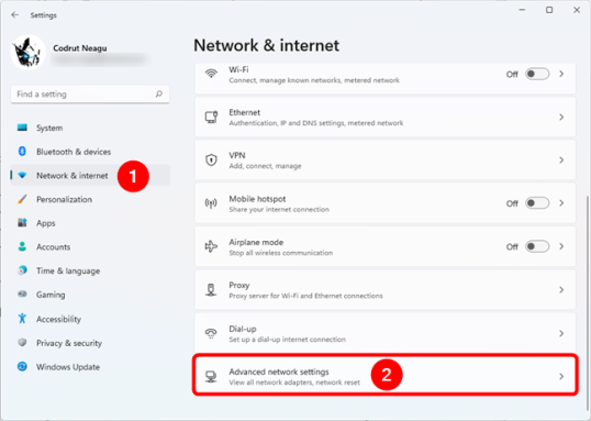Начните с открытия приложения «Настройки» — быстрый способ — нажать Windows + I на клавиатуре. В настройках перейдите в Сеть и Интернет . В правой части окна прокрутите вниз, пока не найдете Расширенные настройки сети . Затем щелкните или коснитесь его.