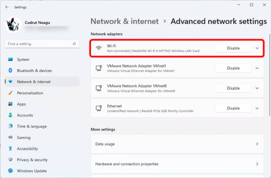 В списке сетевых адаптеров найдите свою карту Wi-Fi и нажмите кнопку Отключить рядом с ней, чтобы отключить Wi-Fi на ПК с Windows 11.