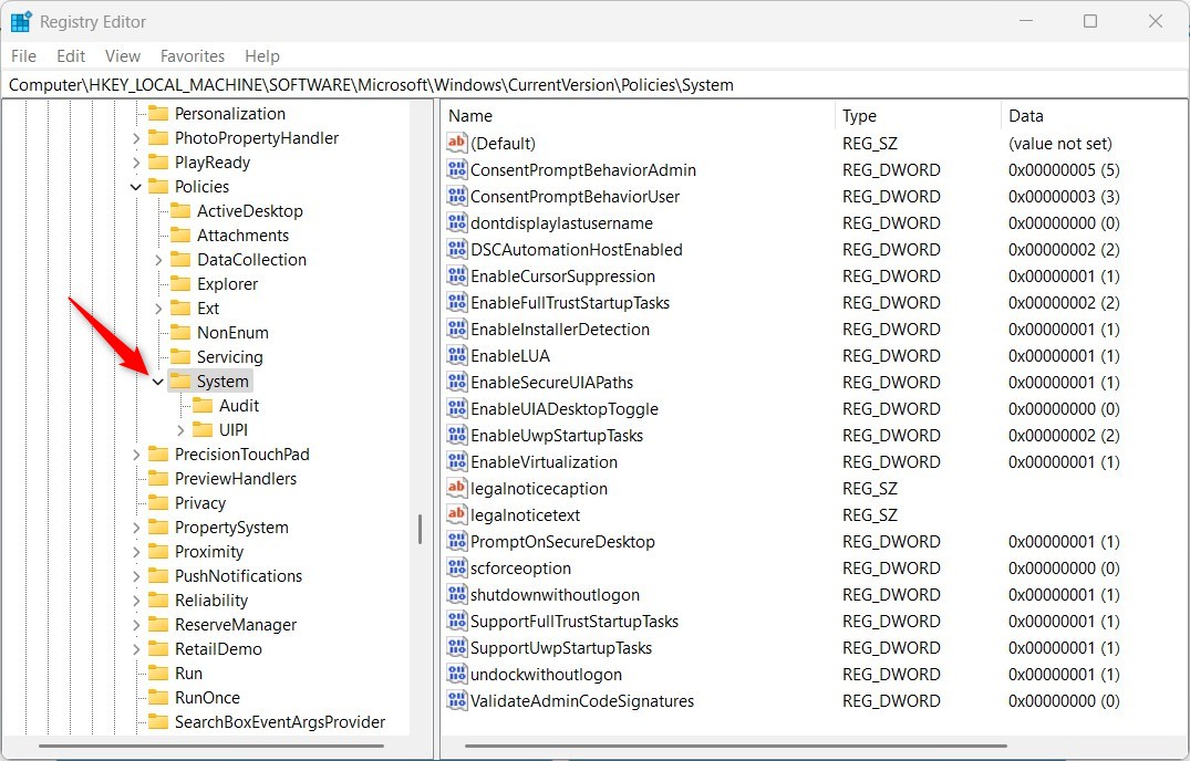 HKEY_LOCAL_MACHINESOFTWAREMicrosoftWindowsCurrentVersionPoliciesSystem