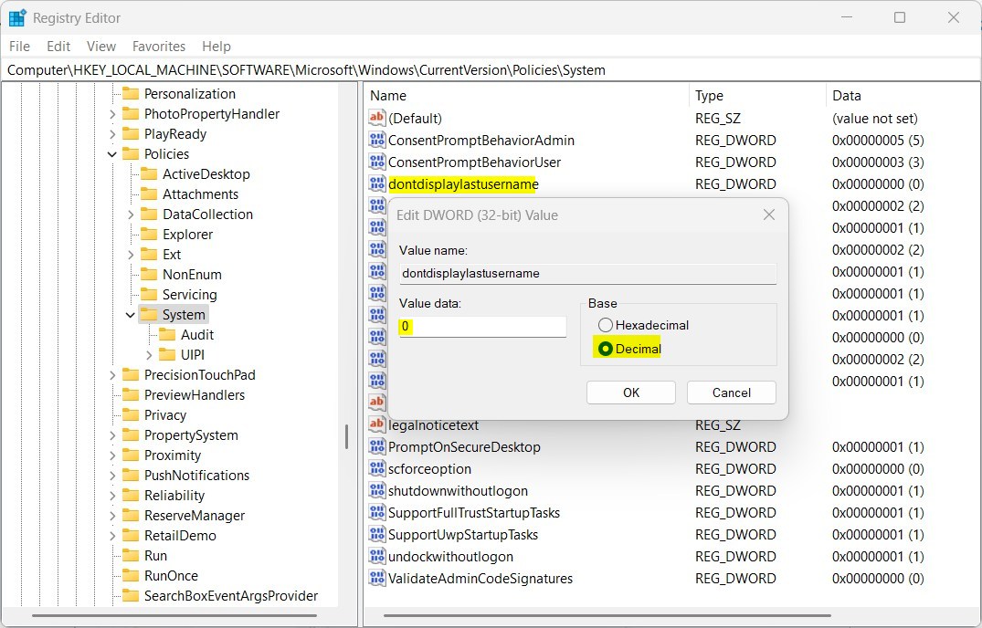 Дважды щелкните имя нового ключевого элемента (dontdisplaylastusername) и убедитесь, что для параметра «Базовый» установлено значение «Десятичный», а затем обновите данные «Значение»: